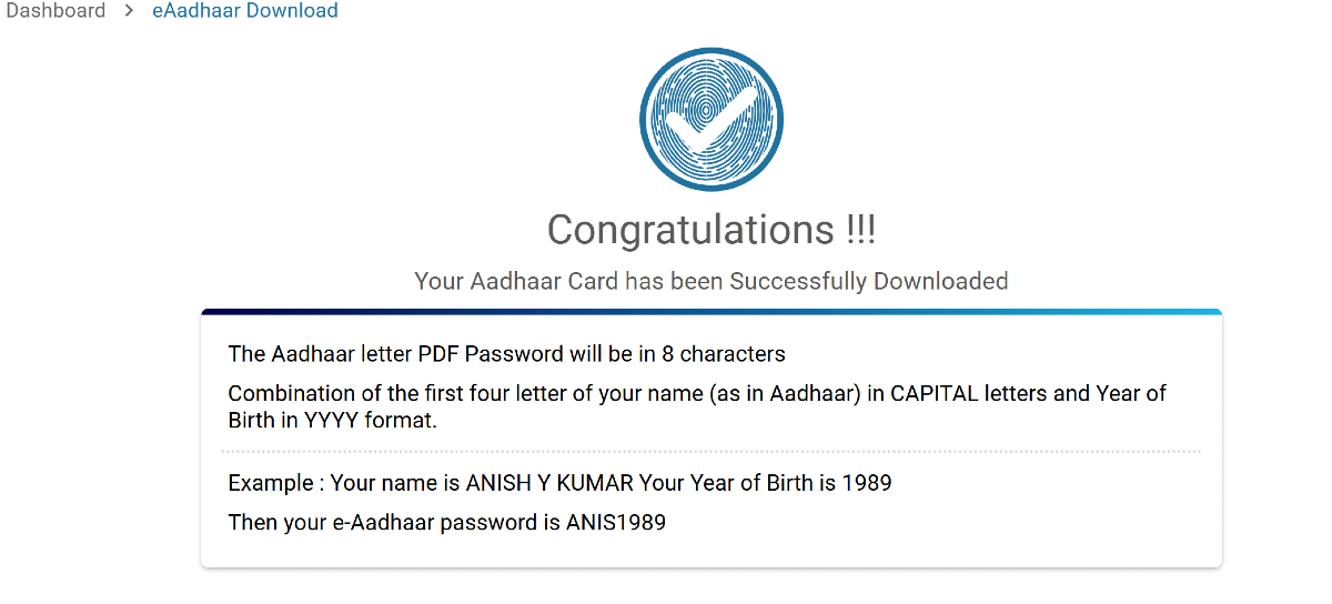 Trinn 7:Din maskerte Aadhaar vil bli lastet ned på enheten din. For å åpne den, skriv inn den førstefire bokstaver i navnet dittmed store bokstaver etterfulgt av dinfødselsår.