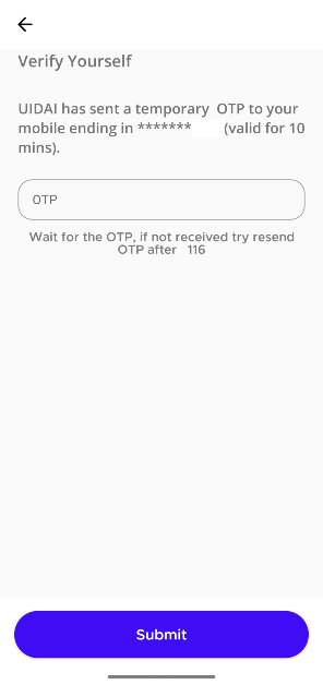 Trinn 5:Merk av i boksen ved siden av 'Vil du ha maskert Aadhar?' og skriv inn engangskoden.