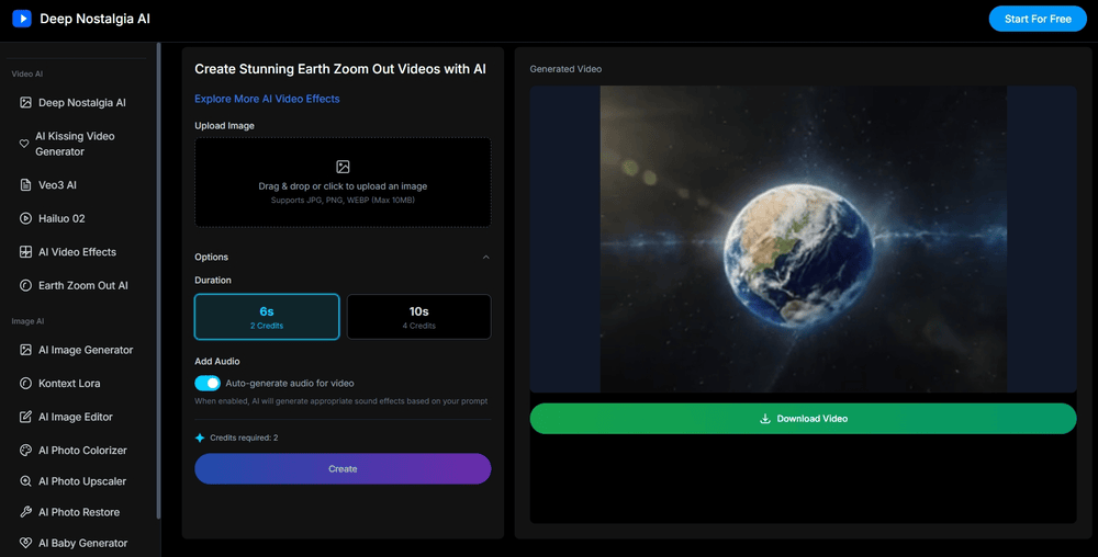 - Gratis å prøve— Du kan generere Earth Zoom Out-videoer gratis etter å ha registrert deg for en konto.