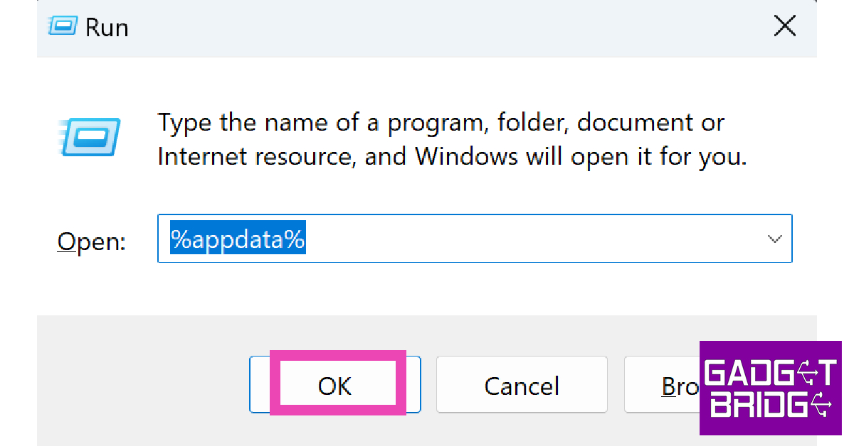 Trinn 3:Skriv inn i popup-boksen%appdata%og trykk Enter.