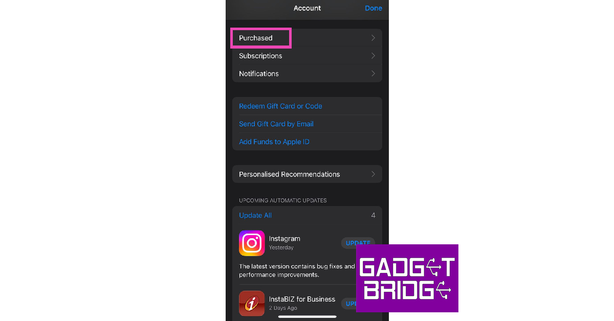 Trinn 2:Velg "Kjøpt". Denne delen inkluderer alle appene du lastet ned på iPhone, ikke bare de du har betalt for.