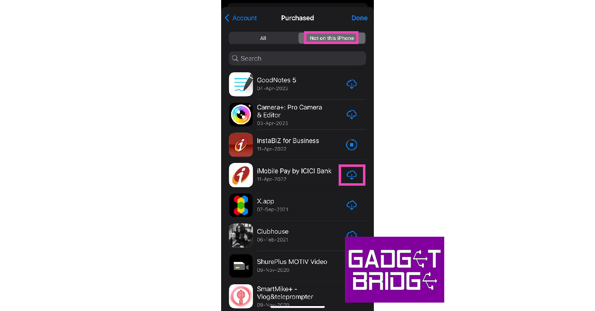 Det er her du vil se alle de tidligere slettede appene på enheten din. Du vil også se appene knyttet til Apple-kontoen din som du kan ha lastet ned på en annen enhet. For å installere en app på nytt, trykk ganske enkelt på skyikonet ved siden av den.