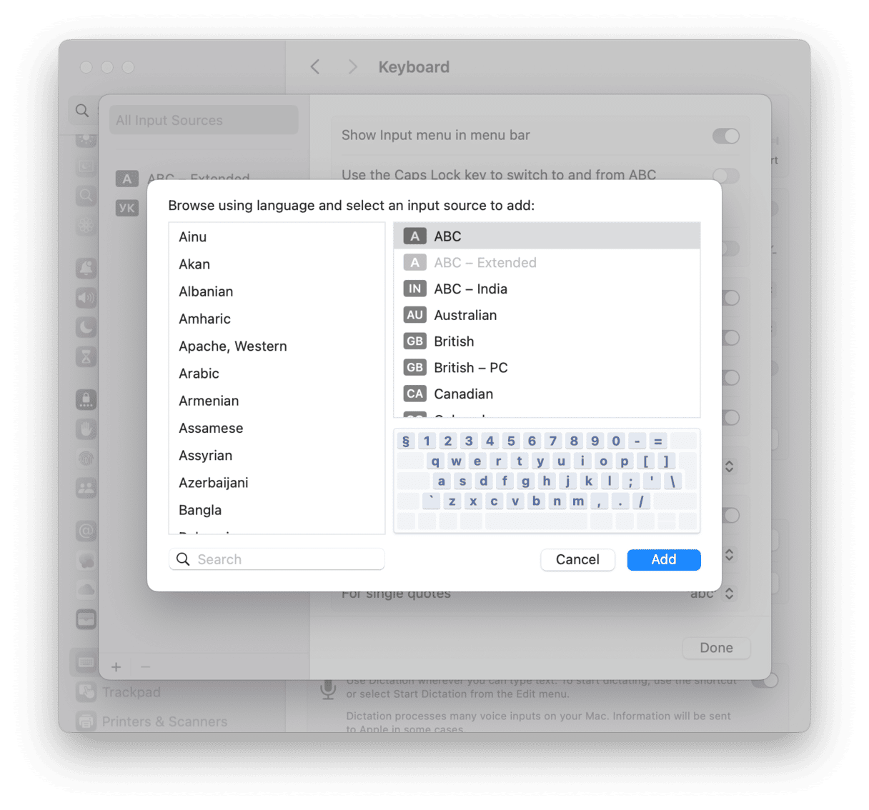 - Velg språket du ønsker fra menyen - du vil se at skjermtastaturet i vinduet endres for å matche valget ditt - og klikk Legg til.