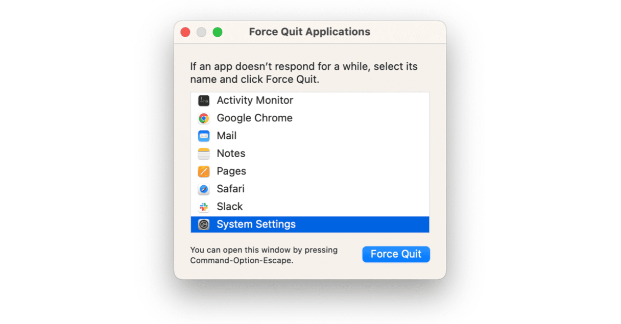 - Trykk Kommando + Tilvalg + Escape, velg Systeminnstillinger i vinduet, og klikk Tving avslutning.