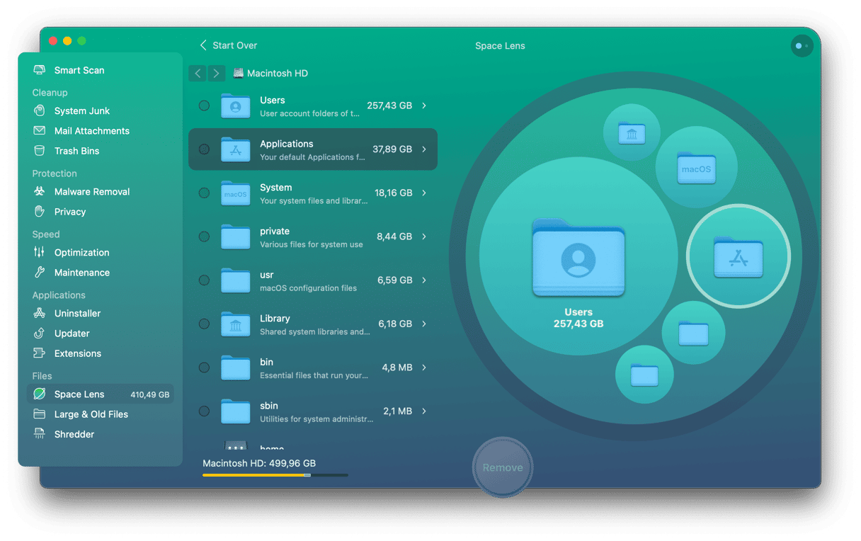 Hvis plass- og ytelsesproblemer plager deg, er det en bedre måte å komme seg under panseret på enn å få tilgang til en privat mappe på en Mac. Ved å bruke eksterne verktøy som CleanMyMac kan du raskt se hva som skjer på Mac-en. For eksempel har nevnte app funksjonen Space Lens. Det den gjør er å bygge et visuelt kart over lagringen din slik at du kan zoome inn/ut og gå inn i hvilken som helst mappe du vil. Det vil vise deg hva som tar så mye plass. Den viser også mapper du vanligvis ikke har tilgang til.