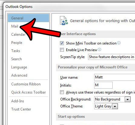 Trinn 4: Klikk påPostfanen på venstre side avOutlook-alternativervindu.