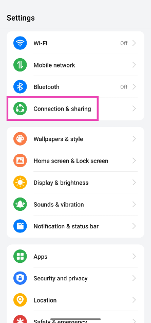Trinn 1:Gå tilInnstillingerog velgTilkoblinger og deling.
