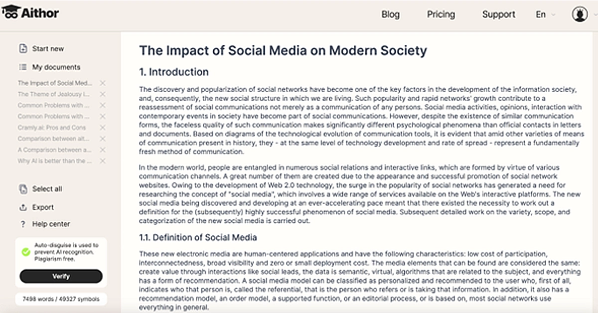 La oss taAithor, en AI-skribent for akademiske og kreative prosjekter som hjelper til med å komme opp med konsepter og ideer for pedagogisk innhold. I motsetning til konkurrentene, jobber Aithor på dokumenter av hvilken som helst lengde, opptil titalls sider. Den tilbyr resultater basert på retningen foreslått av brukeren og er virkelig uoppdagelig som AI.