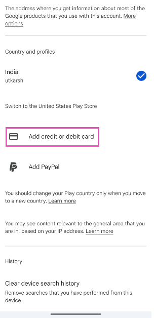 Trinn 5:Trykk på betalingsmåten under 'Bytt til [land] Play Store' kategori.