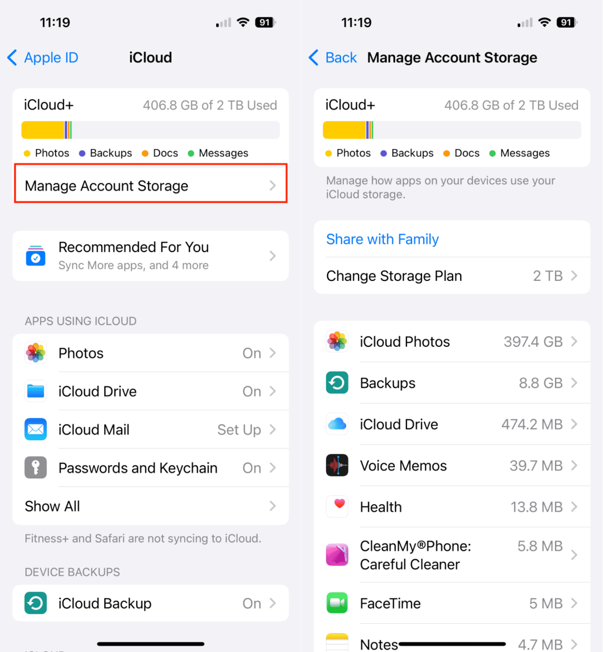 - Velg "Administrer kontolagring" for en mer detaljert oversikt, inkludert en oversikt over hvilke apper som tar mest plass på iPhone. Dette er den beste måten å administrere iPhone-sikkerhetskopiene dine og finne ut om du går tom for plass på iCloud.