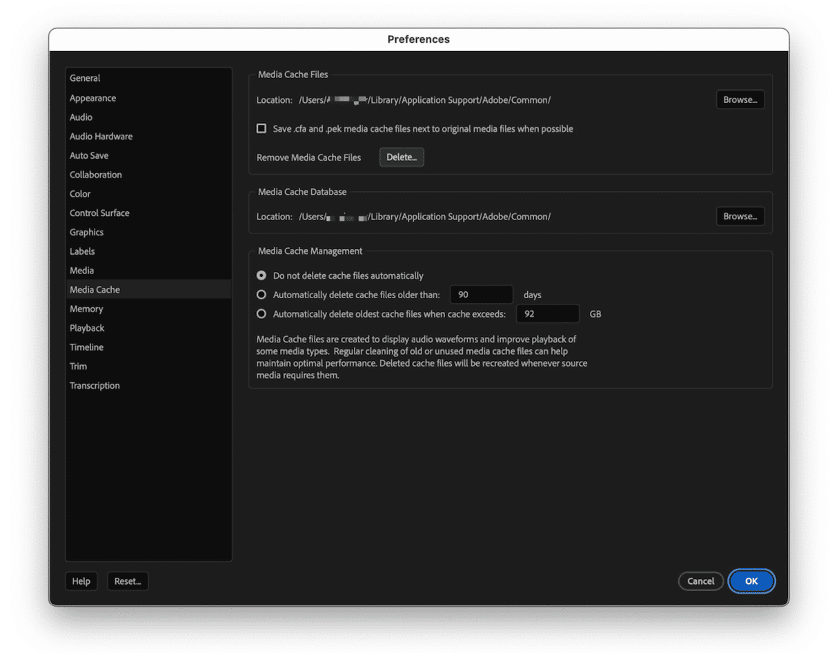Du kan endre innstillingene i Premiere slik at cachen slettes automatisk enten når de når en viss alder eller når størrelsen på cachen overskrider en kapasitet du har angitt.