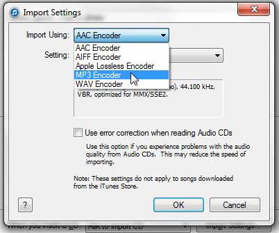 Trinn 4: Klikk på rullegardinmenyen til høyre forImporter med, og klikk deretter påMP3-koderalternativ.