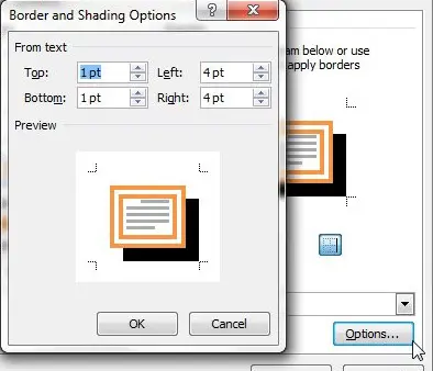 Til slutt klikker du påAlternativer-knappen nederst i høyre kolonne, og spesifiser deretter avstandene til kantene fra teksten. Når du er ferdig med å tilpasse avsnittskantene, klikker du påOKknappen for å lukkeAlternativer for kantlinje og skyggeleggingvindu, og klikk deretter påOKknappen for å lukkeKanter og skyggeleggingvindu.