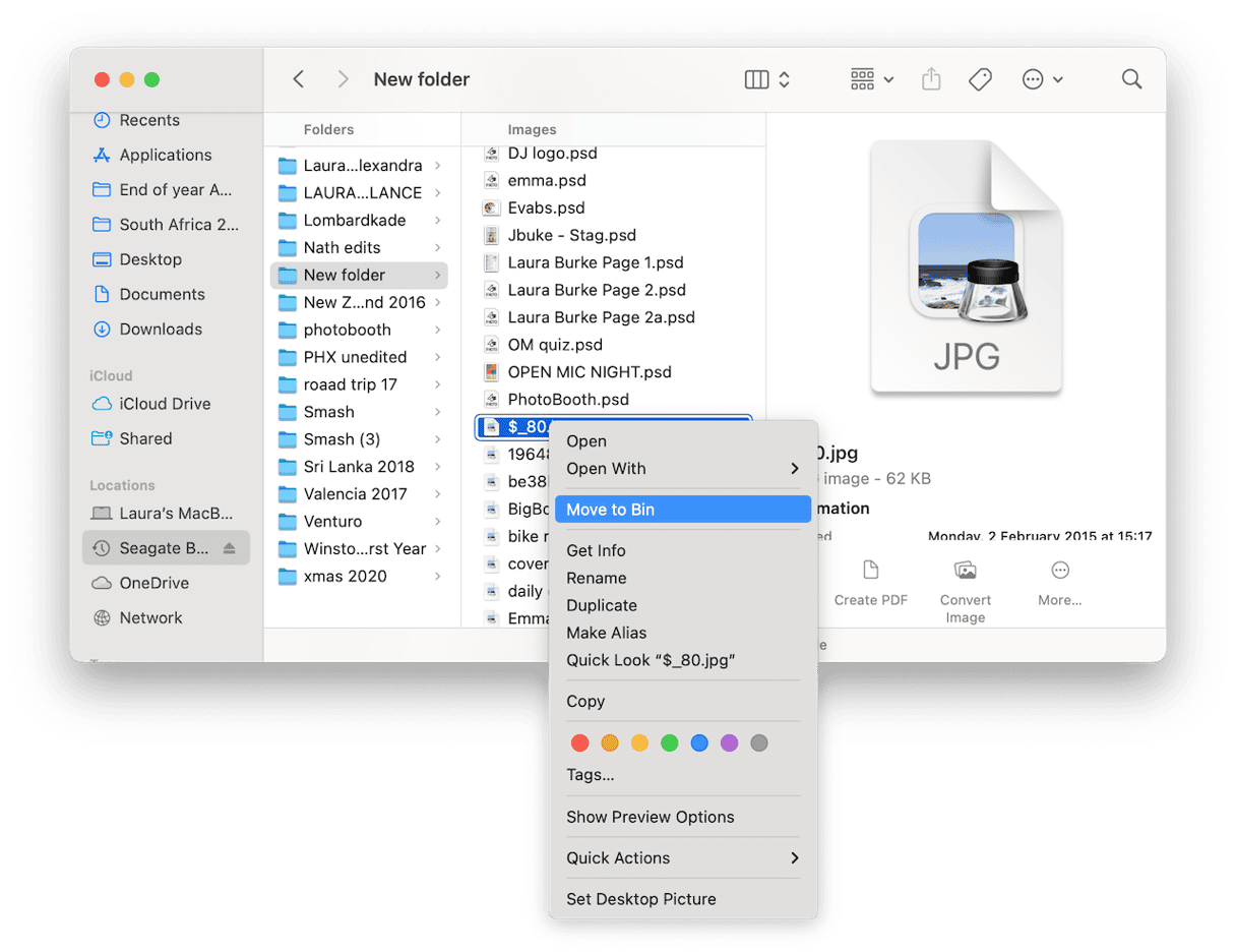 Viktig: Hvis du klarer å slette en fil, er det viktig å huske at filen ikke virkelig forsvinner fra stasjonen før du tømmer papirkurven på Mac-en.