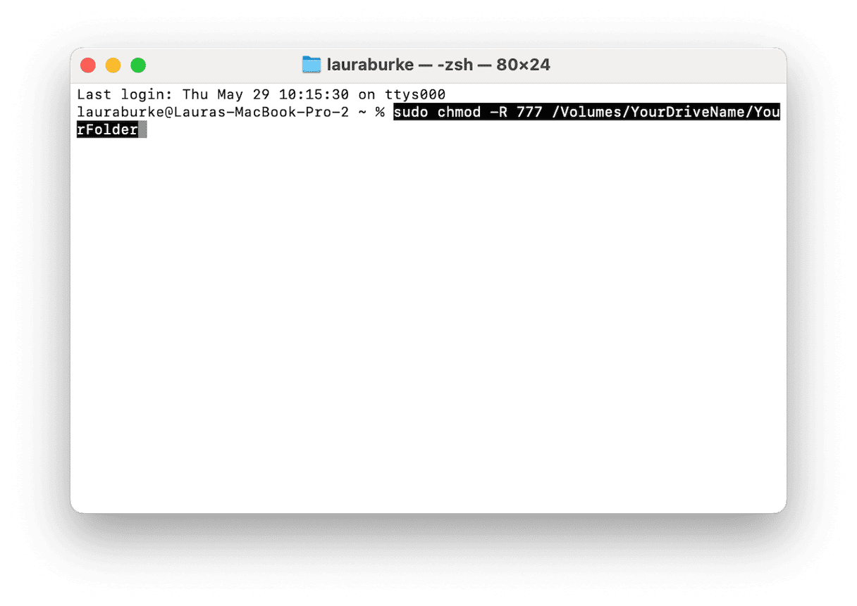 sudo chmod -R 777 /Volumes/YourDriveName/YourFolder - Bytt ut