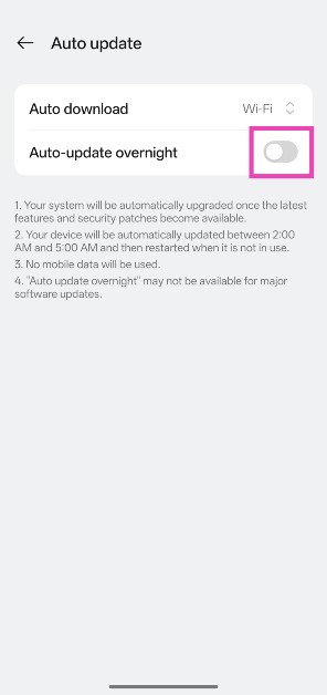 Trinn 5:Slå av vippebryteren ved siden avAutomatisk oppdatering over natten.