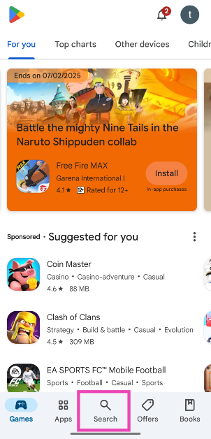Trinn 1: LanseringGoogle Play Butikk-appen på telefonen og bytt tilSøkfanen.