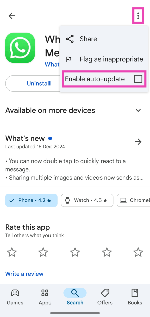 Hvis du vil deaktivere automatiske oppdateringer for en spesifikk app (i dette tilfellet WhatsApp), åpne siden i Play-butikken, trykk på ellipsene og fjern merket i boksen ved siden av "Aktiver automatiske oppdateringer".