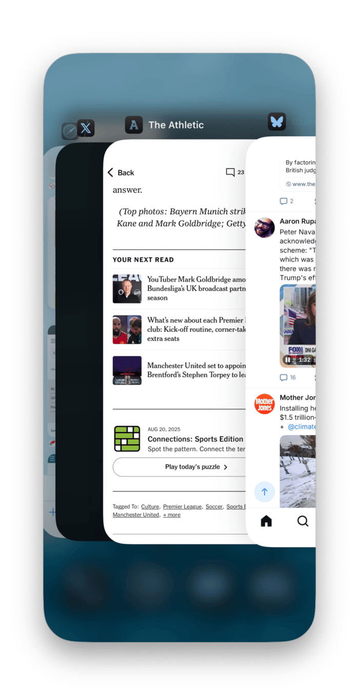 - Flytt markøren rett over toppen av iPhone-skjermen for å se omrisset av vinduet. Der vil du se to ikoner. Den som ser ut som et rutenett tar deg tilbake til startskjermen uansett hvor du er. Den andre aktiverer App Switcher.