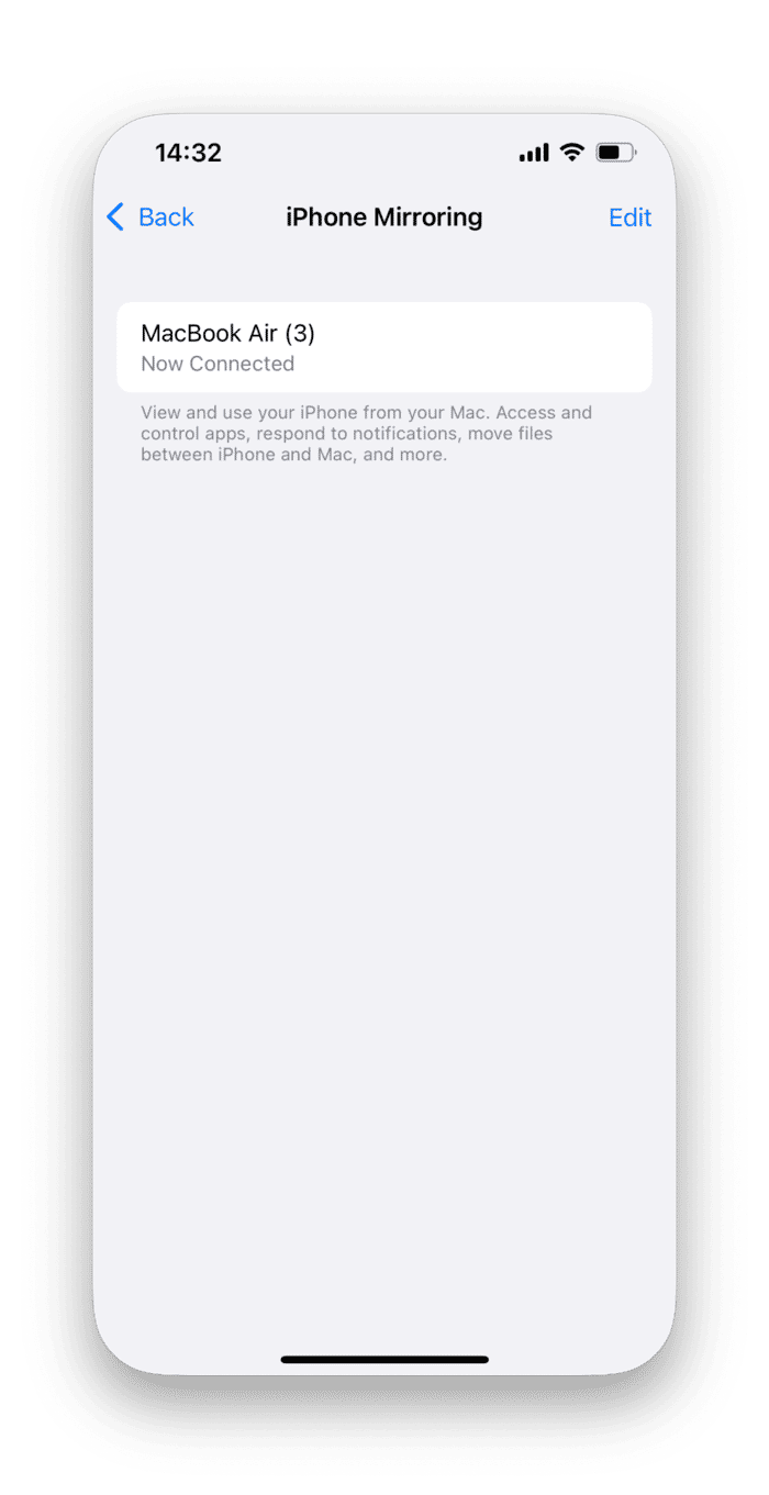 - For å slutte å bruke iPhone med iPhone Mirroring, gå til Innstillinger > Generelt > AirPlay og kontinuitet og trykk på iPhone Mirroring. Trykk deretter på Rediger og velg Mac-en for å fjerne den.