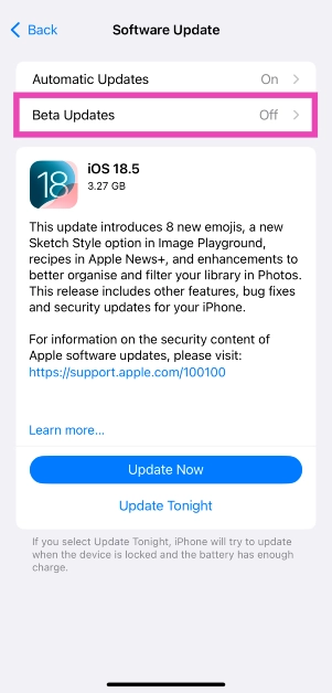 Trinn 8:Trykk påBetaoppdateringer.