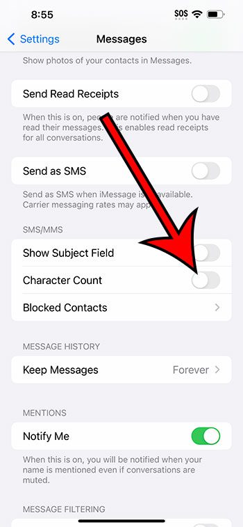 Trinn 3: Rull ned tilSMS/MMSog trykk deretter på knappen til høyre forAntall tegnfor å slå den på eller av.