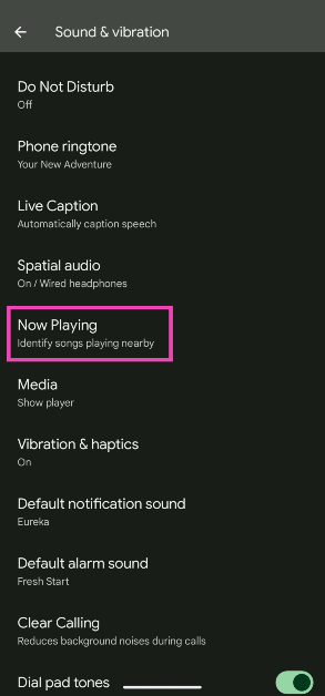 Gå tilInnstillinger>Lyd og vibrasjon> Spiller nåog slå på vippebryteren ved siden av «Identifiser sanger som spilles i nærheten».