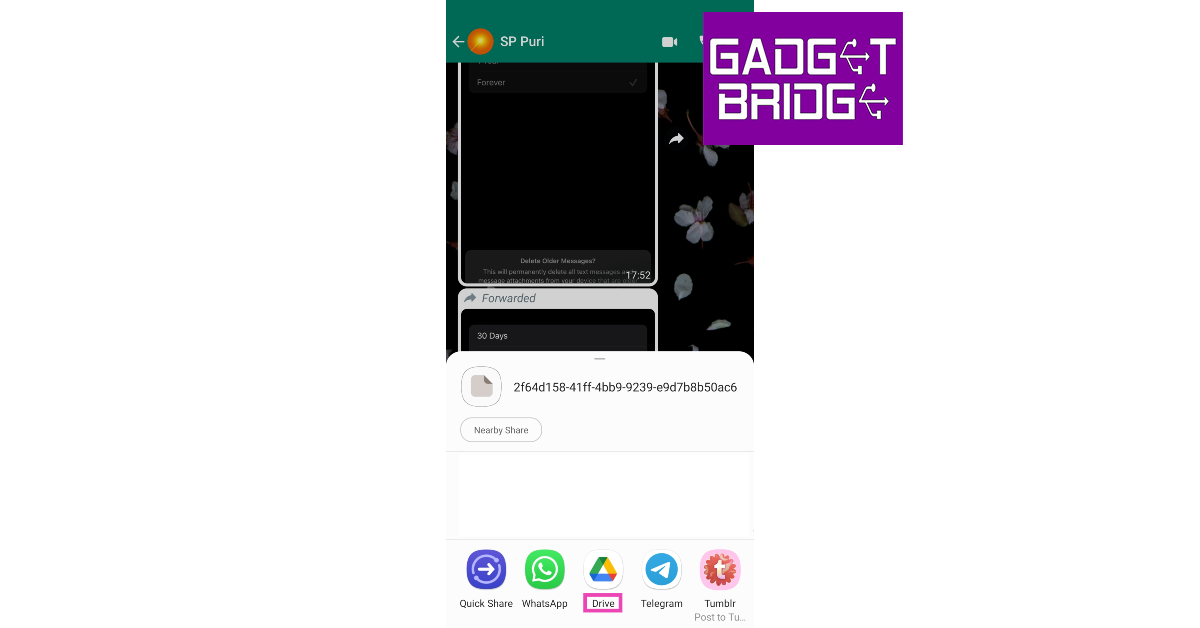 Trinn 6:Velg destinasjonen for tekstfilen. Du kan velge å sende filen til en annen kontakt på WhatsApp eller en annen instant messenger. Hvis du vil lagre filen på enheten din, eksporterer du den først til Google Disk og laster den ned på telefonen.