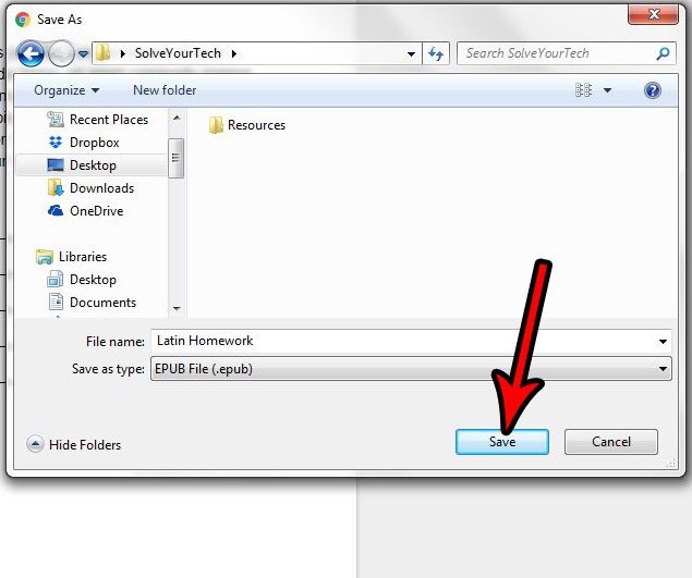 Trinn 5: Velg stedet der du vil lagre .epub-versjonen av filen, og klikk deretter påSpareknapp. Merk at mange nettlesere ikke vil be deg om å velge lagringssted, og vil i stedet laste ned filen til standard nedlastingsmappe.