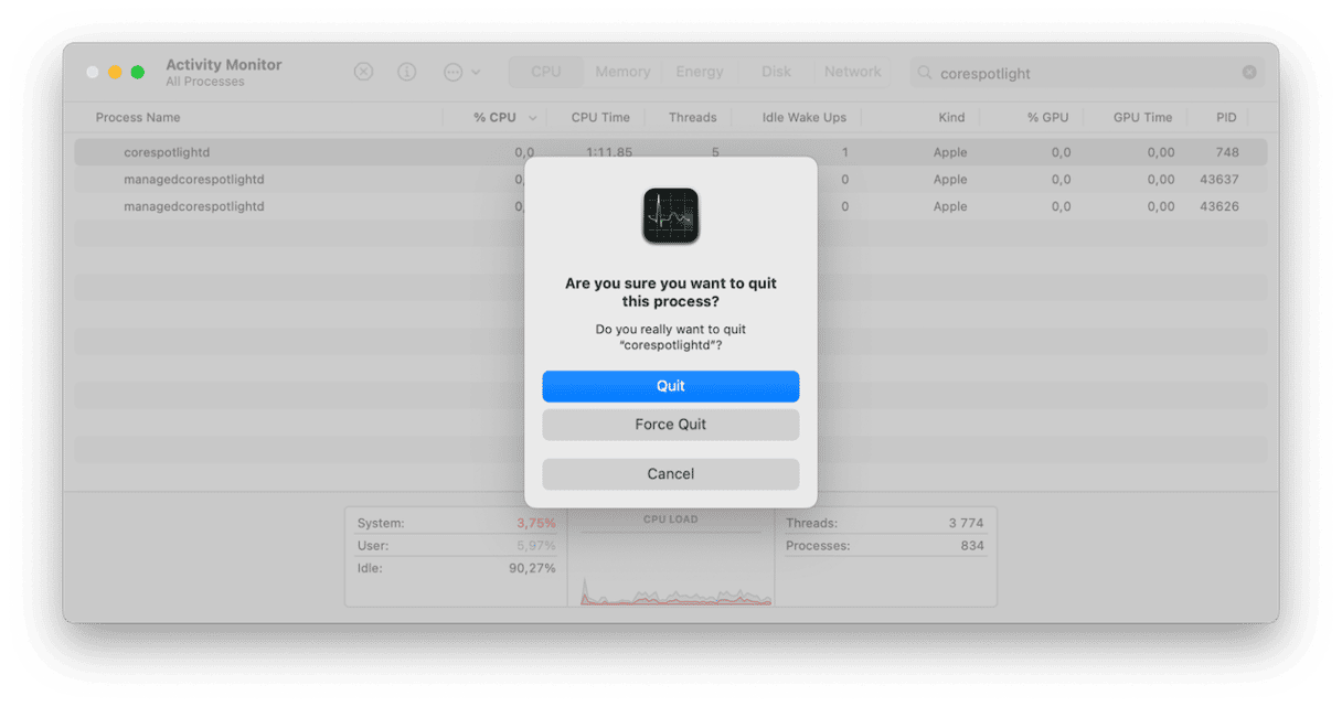 Det første trinnet er å sjekke om Spotlight høy CPU-bruk er en engang og avslutte prosessen. Ingen grunn til bekymring; prosessen starter automatisk på nytt.