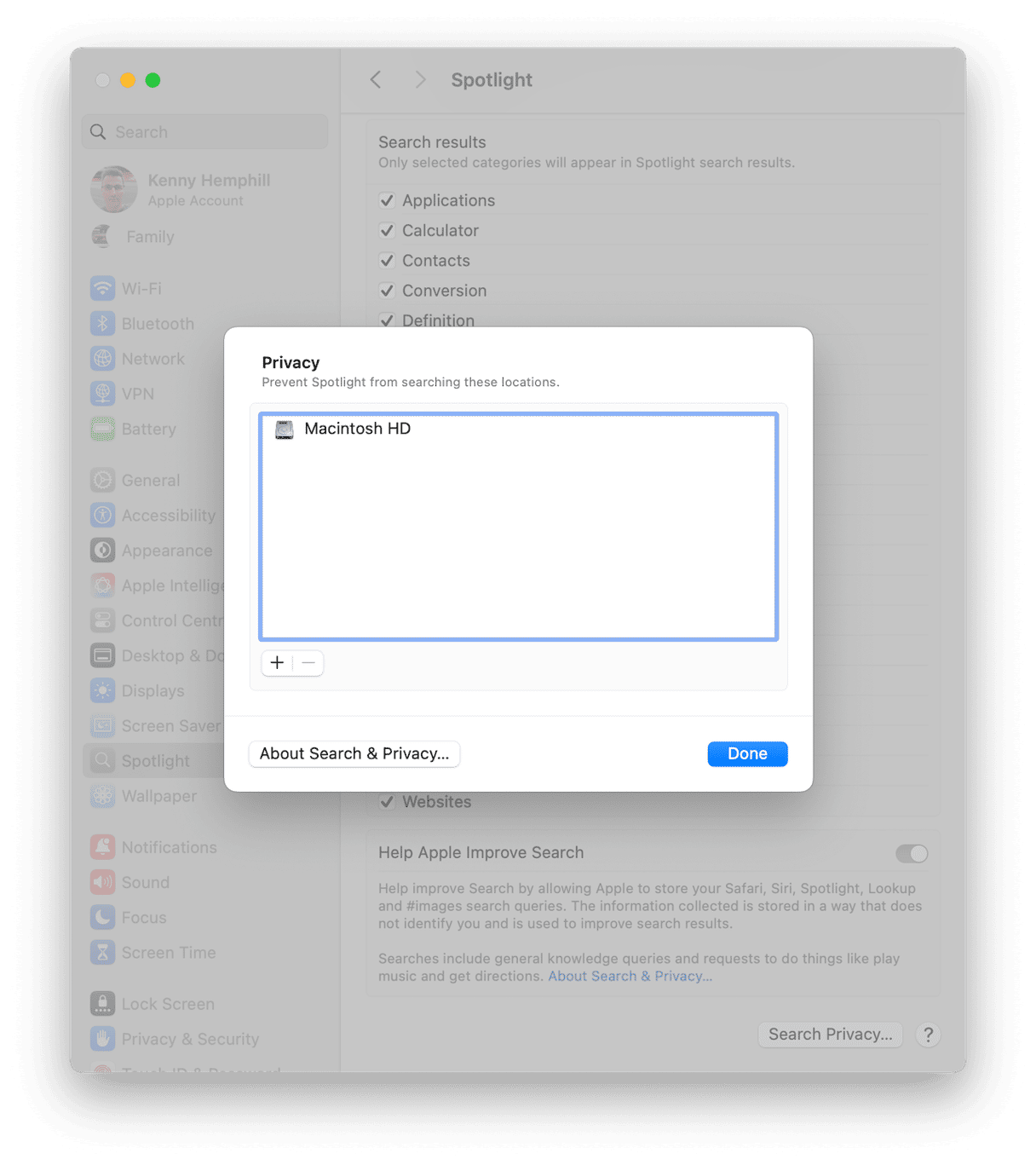 - Vent noen minutter og gå deretter tilbake til Systeminnstillinger > Spotlight > Søk personvern, velg Macintosh HD, og klikk "-" for å fjerne den.