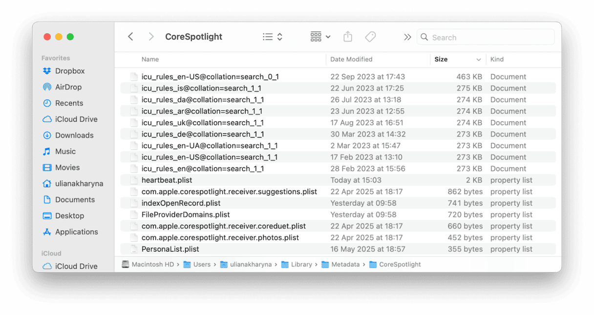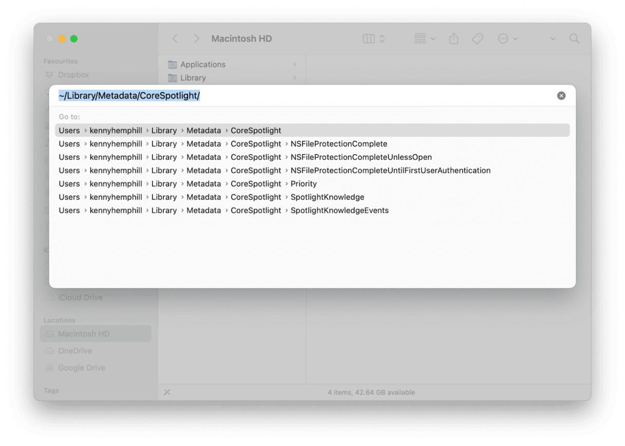 ~/Library/Caches/com.apple.corespotlightd/ - Hvis mappen eksisterer, drar du innholdet til papirkurven og tømmer den.