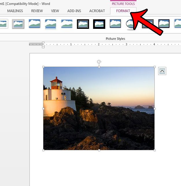Trinn 2: Klikk på bildet for å velge det. Dette vil legge til enBildeverktøy: Formatfanen til toppen av vinduet, som blir den aktive fanen.