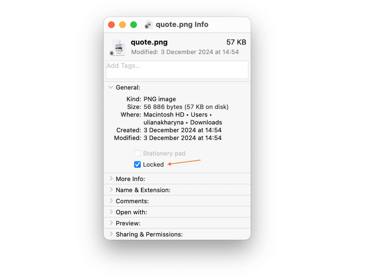 Alternativet for å låse filer på Mac finnes under Få info-menyen hvis du Control + klikker på en fil.