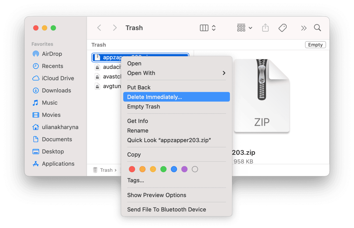 Visste du at du kan slette spesifikke filer i stedet for å fjerne alt du sendte til papirkurven? Alt du trenger å gjøre er bare å velge en fil, høyreklikke eller Ctrl-klikke den og velge Slett umiddelbart.