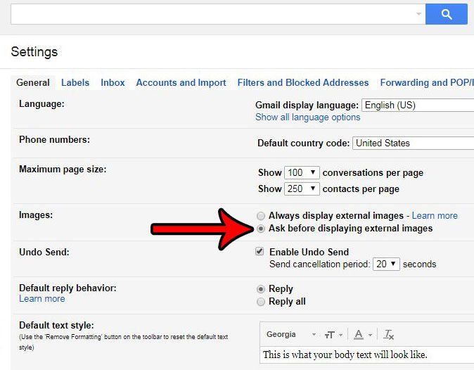 Trinnene nedenfor kommer til å endre en innstilling i nettleserversjonen av Gmail slik at den slutter å vise bilder som standard.