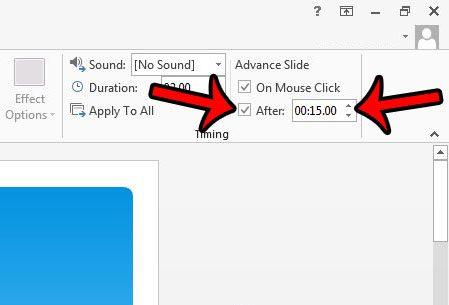Trinn 3: Merk av i boksen til venstre forEtteriTimingdelen av båndet, og klikk deretter inne i feltet til høyre forEtterog velg varigheten du vil at hvert lysbilde skal vises på skjermen.