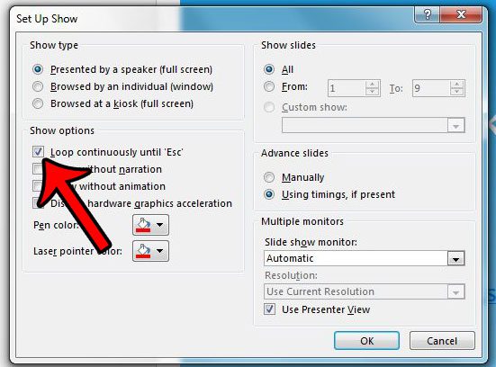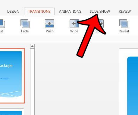 Guiden vår fortsetter nedenfor med tilleggsinformasjon om hvordan du lager en lysbildeseriesløyfe i Microsoft Powerpoint 2013, inkludert bilder av disse trinnene.