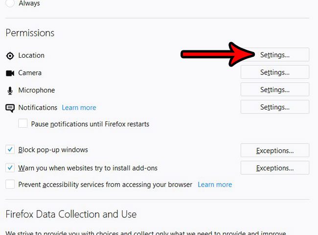 Du kan fortsette nedenfor for utvidede trinn for hvordan du får Firefox til å alltid blokkere plassering, inkludert bilder av disse trinnene.