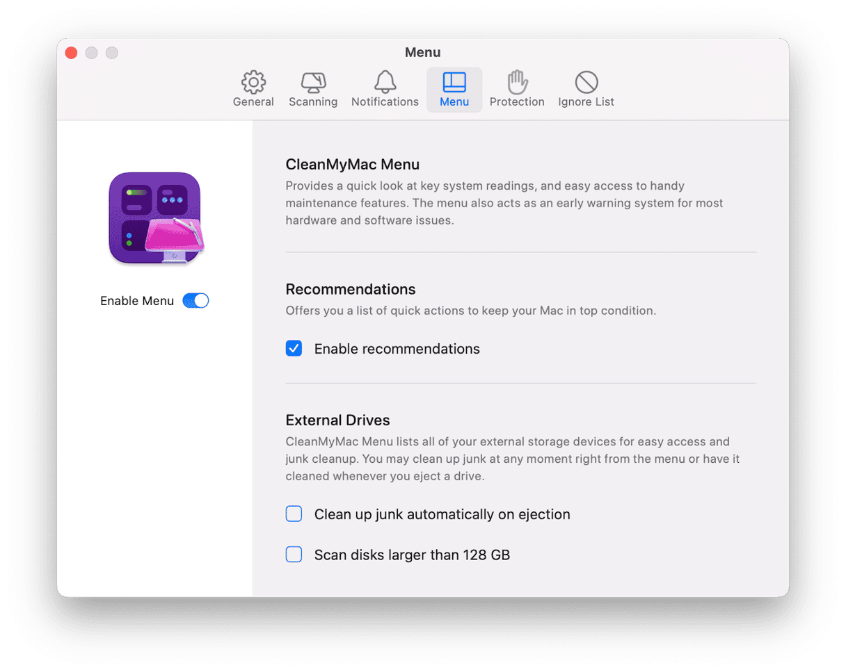 Hvis du av en eller annen grunn ikke kan se iMac-ikonet i menylinjen, åpne CleanMyMac og gå til Innstillinger > Meny for å aktivere det.