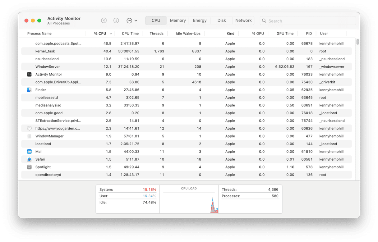 Activity Monitor er en stor ressurs. Den kan raskt fortelle deg hvilke, om noen, prosesser som tærer på systemressurser. Enhver prosess som bruker mer enn sin rettferdige del av ressursene er sannsynligvis årsaken til en etterslepende MacBook.