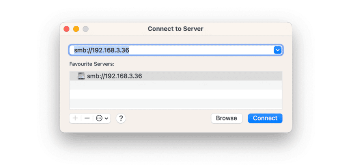 Hvis du ikke vil måtte skrive inn adressen til en server hver gang du kobler til den, klikker du på ‘+’ nederst i Koble til server-vinduet for å legge den til i favorittene dine.