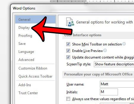 Trinn 4: Klikk påUtstillingfanen på venstre side avOrdalternativervindu.