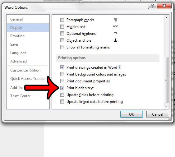 Trinn 5: Rull ned tilUtskriftsalternativerdelen av denne menyen, og klikk deretter på boksen til venstre forSkriv ut skjult tekst. Du kan deretter klikke påOKknappen nederst i vinduet for å bruke endringene.