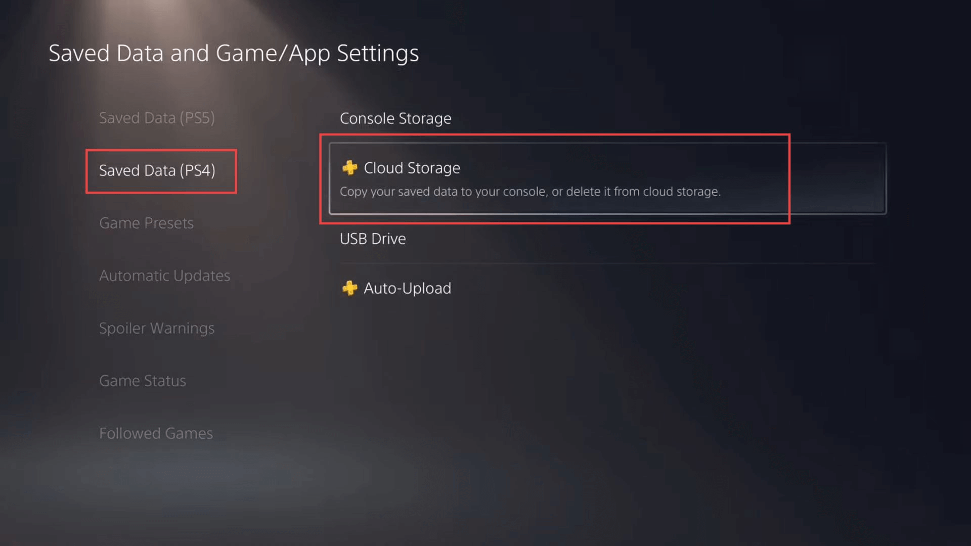 Trinn 3– velg deretterLagre data (PS4)på konsollen din. På alternativene der, finn Minecraft-oppføringen. Vennligst ikke det, selv om du spiller på enPS5, vil disse alternativene bli funnetunder ps4-spill.