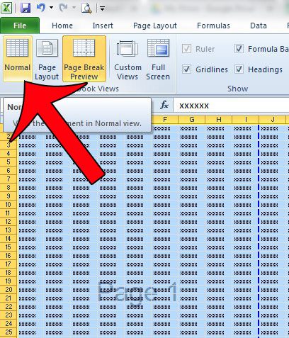 Hvis svaret på dette spørsmålet er ja, er regnearket ditt inneSideskiftutsikt. Hvis svaret er nei, kan du fortsette til neste spørsmål. Du kan avslutteSideskiftse ved å klikke påUtsiktfanen øverst i vinduet, og klikk deretter påNormalalternativet iArbeidsbokvisningerdelen av navigasjonsbåndet.