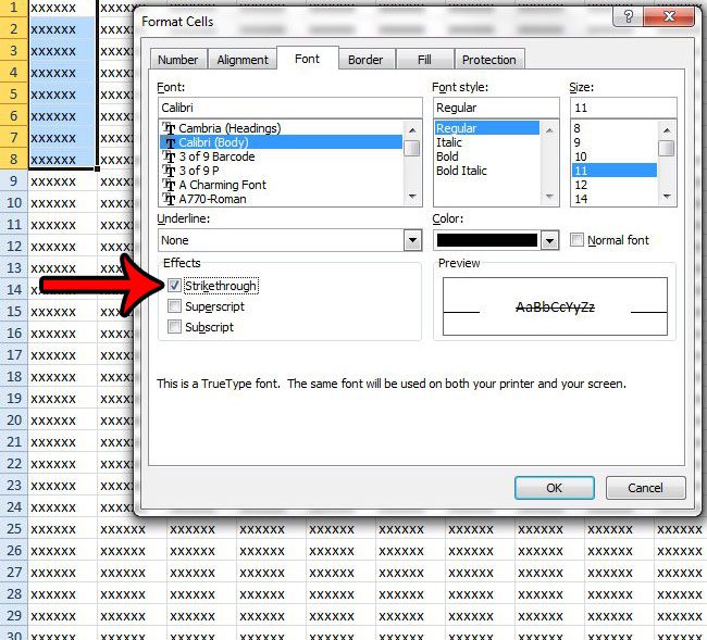 Trinn 4: Merk av i boksen til venstre forGjennomstrekingfor å bruke effekten på dataene i de valgte cellene. Klikk påOKknappen for å lukke vinduet.
