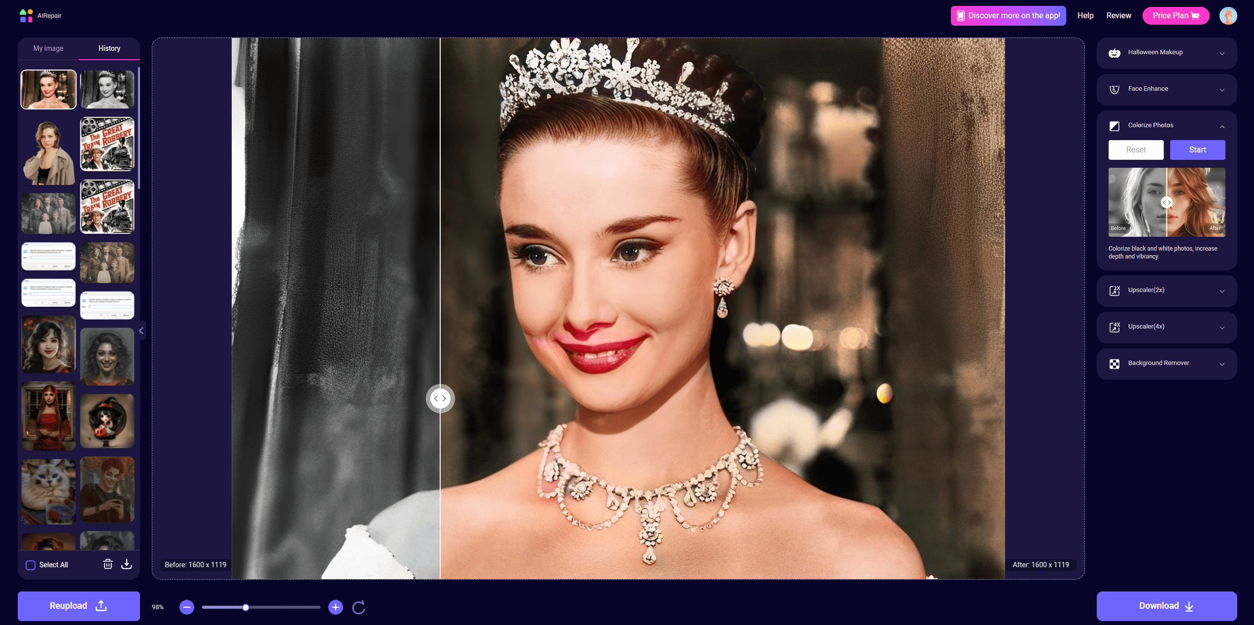 AIRepair online er den beste appen for å reparere gamle bilder, som lar deg omfarge svart-hvitt-bilder. Det er en allsidig bildeforbedring som tilbyr ulike funksjoner, inkludert fikse uskarpe bilder, bildeoppskalering, bakgrunnsfjerner, bruk av Halloween-sminke på bilder, etc.