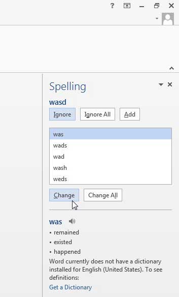 Trinn 3: Velg hva du skal gjøre med noen av de feilstavede ordene som stavekontrollen finner iStavemåtepanel på høyre side av vinduet.