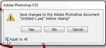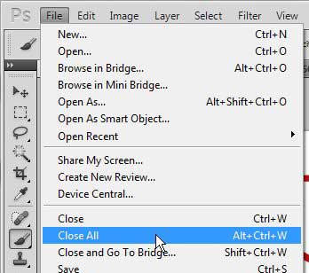 Denne prosedyren kommer til å dra nytte av et annet verktøy i Photoshop CS5 -Lukk allekommando. Dette er kanskje ikke noe du noen gang har brukt før, men det inneholder faktisk alternativet som vi må utnytte for raskt å lukke og lagre alle våre åpne bilder.